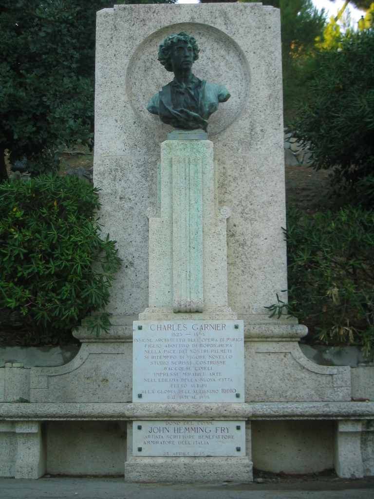 En redescendant au travers du jardin, je trouve le monument qui se veut un hommage à Garnier. Un buste coiffant une colonne, le tout adossé à un banc et un mur de calcaire. Un bronze comme on en voit tant, représentant un jeune homme dont le visage est séduisant et m’est familier puisque je l’ai vu tant de fois rue Auber à Paris.