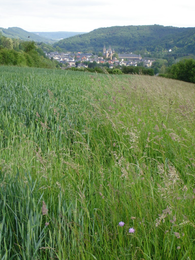 Je suis un piéton, un promeneur au Luxembourg. Et si je ne voyageais pas si souvent, je pourrais penser que je vis dans une sorte d’île enchantée. Je le pense parfois. Comme ce matin qui précède le mardi de la Pencôte et la procession dansante d’Echternach. Je regarde les étendues de céréales et la vue plongeante que devaient contempler les pèlerins venus du plateau lorsqu’ils découvraient la basilique. Mais il ne s’agissait sûrement d’autres récoltes et en tout cas d’une autre basilique puisque la dernière guerre a nécessité la reconstruction complète de celle-ci.