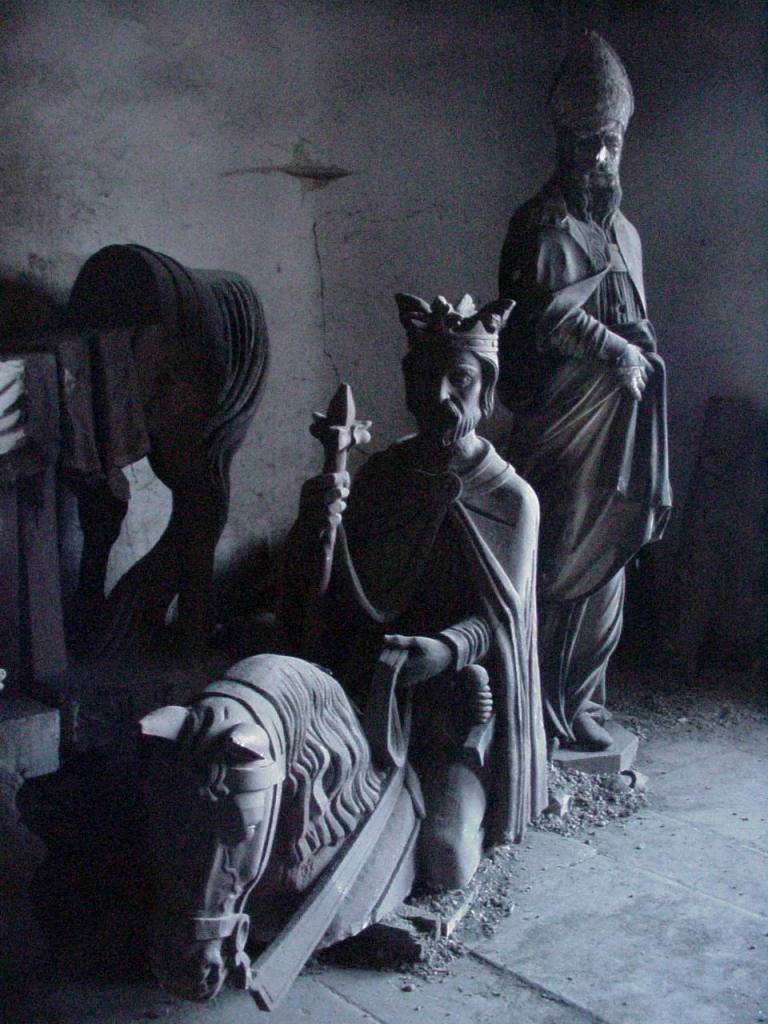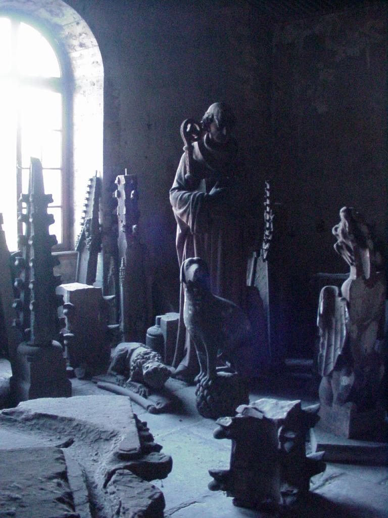 Ces cages sont vraiment surréalistes. La poussière s’est accumulée sur ces statues de grès rose. On y rencontre des figures d’anges à têtes de lion, des morceaux de pylônes, des arêtes gothiques, des fragments de rosaces, deux angelots en admiration, tournés l’un vers l’autre et dont les sexes sont pudiquement voilés, certainement en raison de leur trouble réciproque, un roi dont le cheval est curieusement tronqué et qui semblé naviguer sur le sol, un masque grotesque qui aurait pu devenir une gargouille.