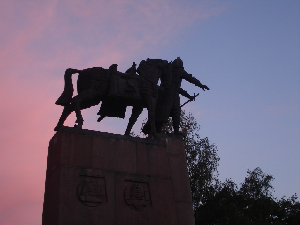 Tout cela entre deux églises baroques, entre deux temples de la consommation récemment construits, sur le pavé de l’avenue Gedyminas, interdite aux voitures et autour du château du même Gedyminas, Grand-Duc de Lituanie, né au tournant de la fin du XIIIe siècle, dont le règne s’étend de 1316 à 1341. Sa statue cavalière paraît ce soir comme un remord éternel. (Merci au lecteur qui m’a convié à donner des dates exactes…).