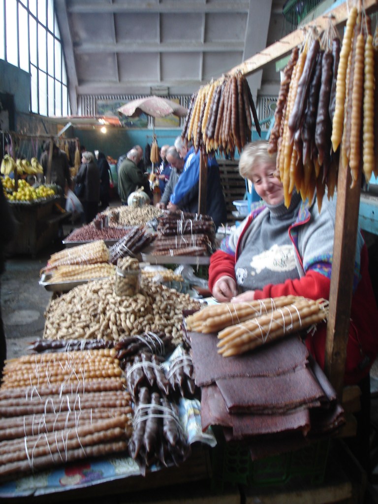 Maïs grillé, galettes de fromage, fromage cuit, tomates, cornichons et herbes diverses. Voilà pour l’entrée. Soupe le plus souvent de mouton, vinaigrée. Poulet aux noix et au coriandre. Mouton en ragoût avec des pommes de terre ou des aubergines aux noix, mais aussi des Tolma (les dolmas ne sont pas loin). Vous trouverez aussi des crépines de porc serrées de baies de grenade ou des raviolis à la viande de porc ou de bœuf mêlés, les khinkalis. Nous sommes en pays Orthodoxe… ! Les poissons de rivière, carpes ou poissons chats, jusqu’aux trésors de la Mer Noire…Et enfin une gamme de desserts dont les plus dépaysants, en dehors des nougats et des friandises au miel parfaitement orientales, sont les Tchourtchkhéla, ces chapelets en forme de bougie formés d’une feuille de pâte de fruit issue de l’évaporation de jus divers enveloppant des noix ou des noisettes.