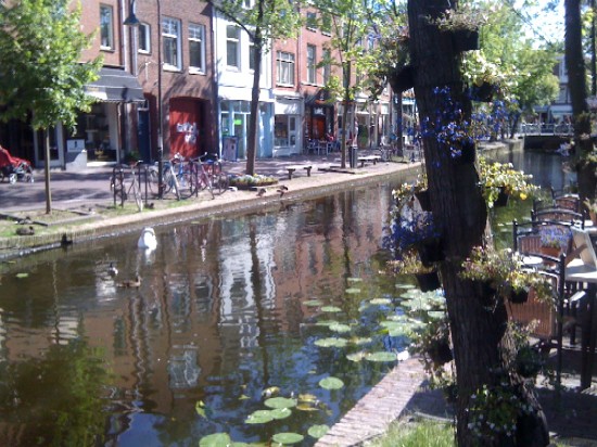 De quai en quai le soleil fait fleurir des roses à l’angle d’une maison, maison dont la fenêtre est ouverte sur la rue, malgré ses guipures entre lesquelles l’intérieur se devine. La fenêtre comme une vitrine où un masque indonésien fait basculer l’imaginaire vers les tropiques. Le climat est tropical en effet et les nénuphars se répandent sur l’eau calme comme des berceaux. Bleu de Delft, Bleu de Chine, Bleu d’Orient. Il manque une perle à l’oreille de la femme aimée, adorée, sanctifiée. La vierge profane de Vermeer, ancrée dans le paradis terrestre de la ville serpentine, labyrinthique. Une ville piège. J’avoue que là aussi je n’étais plus revenu depuis que mon père m’y a amené. Les élus me regardent d’un air étrange quand je leur fais cette réponse d’un siècle précédent. Je leur avoue, pas seulement pour leur faire plaisir, qu’ils ont su garder l’atmosphère de mes vingt ans parfaitement intacte !