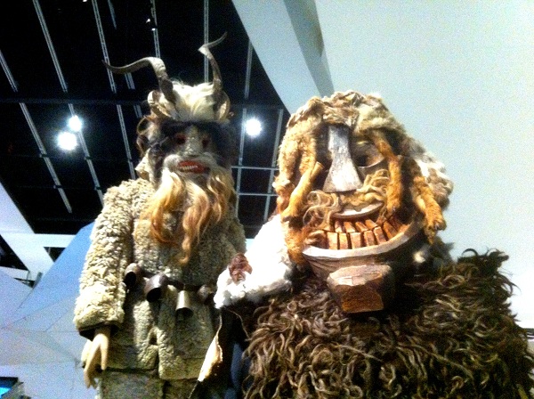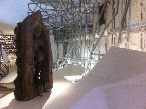 L’exposition « Les Maîtres du Désordre » au Musée du quai Branly a été préparée sous le commissariat attentif de Jean de Loisy, président du palais de Tokyo et par ailleurs grand maître de la nouvelle Triennale. Il a été aidé en cela par Nanette Jacomijn Snoep pour ce qui concerne les collections du musée et par Bertand Hell pour la dimension anthropologique. Le projet scénographique, conçu par l’agence Jakob+MacFarlane fait l’objet sur le site web d’une description assez initiatique. Pour tout dire, le système d’exposition est tellement présent qu’il faut absolument en parler, au moins autant que l’exposition elle-même. On pourrait presque dire qu’il occulte parfois le propos tant on acquiert l’impression à certains endroits que ce sont les œuvres qui constituent le décor de la scénographie et non l’inverse. Le thème, tel qu’il est exprimé par la mise en espace, semble en effet pris uniquement au premier degré : mettre du désordre en affichant des tubulaires déjantés entourés de bandes Velpeau et en laissant les faux-plafonds ouverts, en utilisant des vitrines trouées et maculées de plâtre dont la barbotine a débordé. En un sens, il est difficile de faire plus littéral. Ceci dit, on finit par se prêter à l’idée que les objets viennent d’être déballés et que l’on découvre une exposition en cours de montage, à l’intérieur de laquelle on peut faire son marché. Le souk, quoi !
