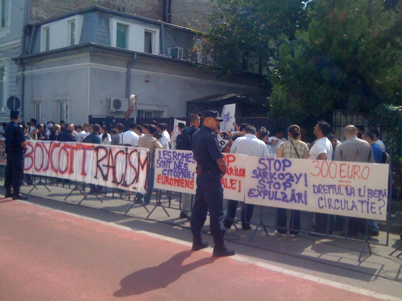 Combien puis-je sélectionner d’images sur la Roumanie parmi les milliers prises en plus de quinze années qui disent vraiment la Roumanie et qui en racontent un moment significatif ? Celle des manifestants d’associations Roms devant l’ambassade de France, à côté de chez moi, il y a deux ans dans les jours où les ministres français de droite étaient venus en visite ? Probablement, puisqu’en rappelant que la liberté de circulation, c’est-à-dire le droit de revenir au pays en y étant contraint, coûte 300 euros, elle garde une actualité frappante à la suite de la visite récente des ministres français de gauche, des hommes aussi désemparés que leurs prédécesseurs.