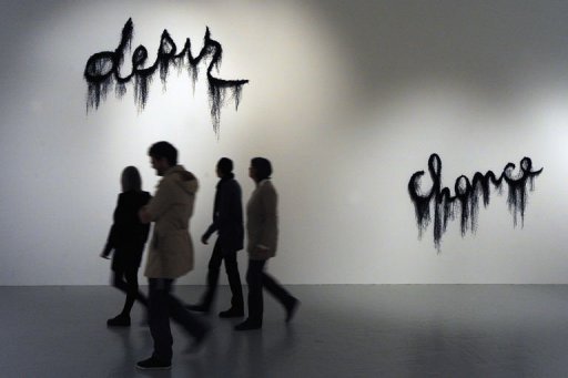 L’exposition est encore face à moi jusque début février. J’aperçois, de la place où j’écris, les chiffres bleus de Morellet qui désignent sa vie en approches mathématiques sur la façade du musée d’art moderne. Je peux donc rêver que les œuvres dialoguent dans la nuit : continents bleus pétris de logique contre continents noirs habités de désirs hystériques. Ce n’est pas un dialogue, il est vrai, mais un combat entre ciel et terre, anges et démons. Peut-être que les conservateurs l’ont voulu ainsi ? Peut-être pas ? Dans tous les cas, je les entends d’ici : c’est seulement aujourd’hui que tu nous écris ?